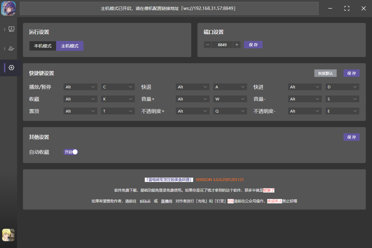 首先点击左侧导航栏的设置按钮,如果用户只是单机用户(指只有一台电脑)。只需要关心「快捷键设置」和「其他设置」这两个区域的设置内容。